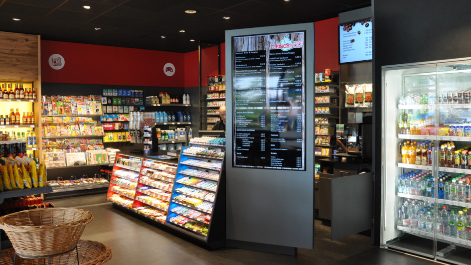 von 7: Im Shopbereich gibt es das klassische Tankstellensortiment. Der etwa 20 Quadratmeter große Bereich ist durch einen dunklen Boden vom Rest des Raumes abgehoben.