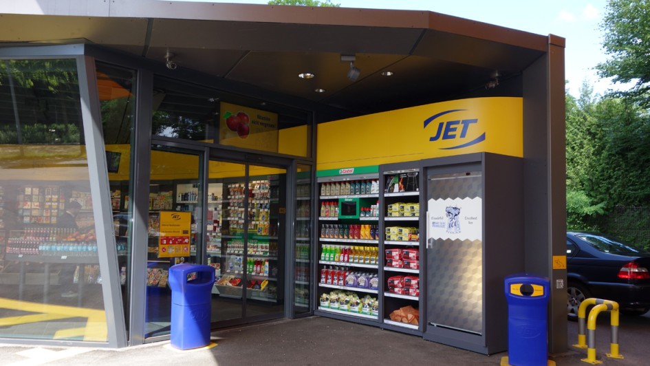 von 6: Motorenöle und Crushed Ice rückte JET von den Fenstern weg und platzierte sie unter das Vordach. Der bogenförmige Shop ist schon von außen einsehbar. Das erleichtert die Orientierung.