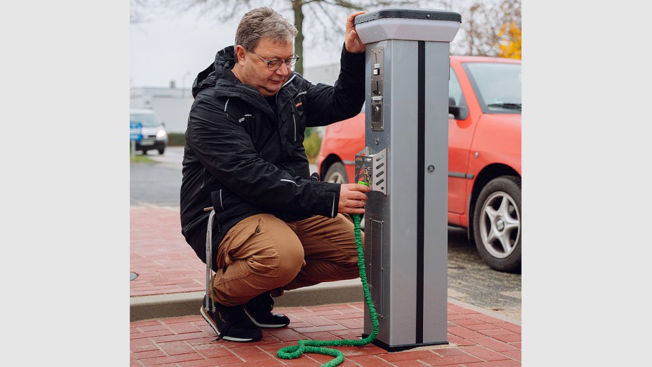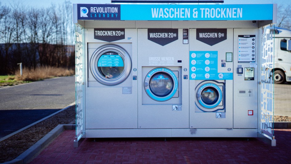 von 9: Die Waschmaschinen der ME Group fassen neun und 20 Kilogramm. Es gibt auch einen Trockner. "Wir stellen den Platz und den Wasseranschluss und erhalten dafür im Gegenzug von der ME Group eine Provision pro Nutzung", erklärt Derksen. Ist der Waschvorgang beendet, erhalten Kunden eine SMS, sodass sie bis dahin gemütlich in ihrem Wohnmobil warten können.