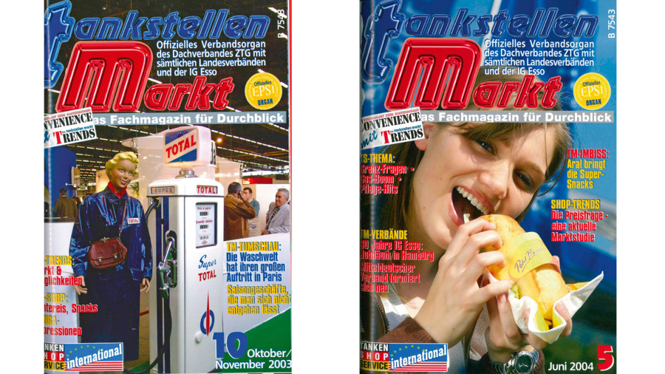 Der Dame auf dem Cover von 2004 macht sich genüsslich über das Sandwich aus einem Petit Bistro her. "Aral bringt die Super-Snacks", meint die tm-Redaktion.