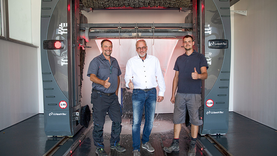 von 16: (v.l.n.r.) Norbert Meyer (Inhaber und Kraftfahrzeugmeister), Matthias Rotter (Washtec Gebietsverkaufsleiter Süd, Portalanlagen) und Christian Meyer (Kraftfahrzeugtechnikermeister und Ansprechpartner in Sachen Wasch- und Pflegetechnik).
