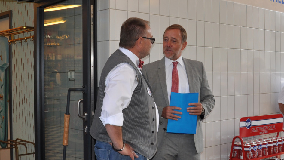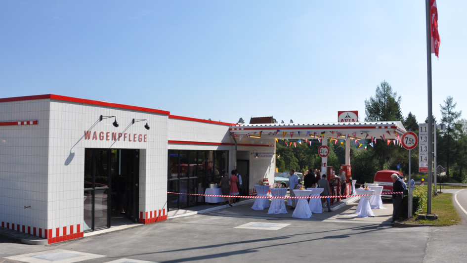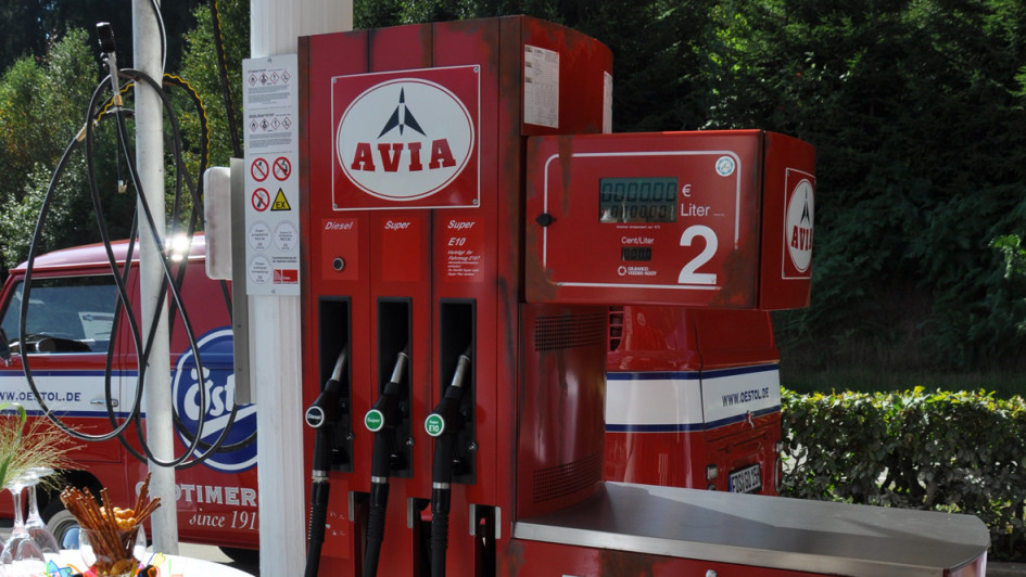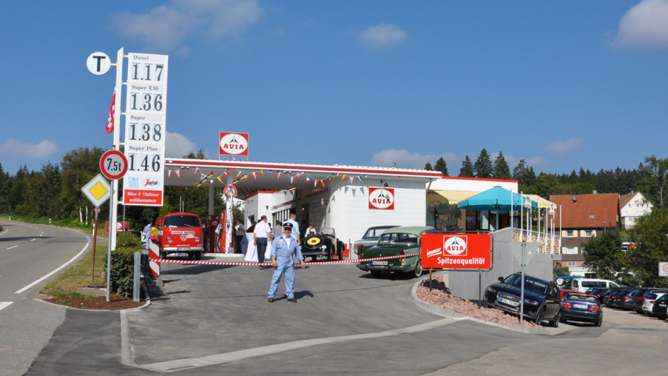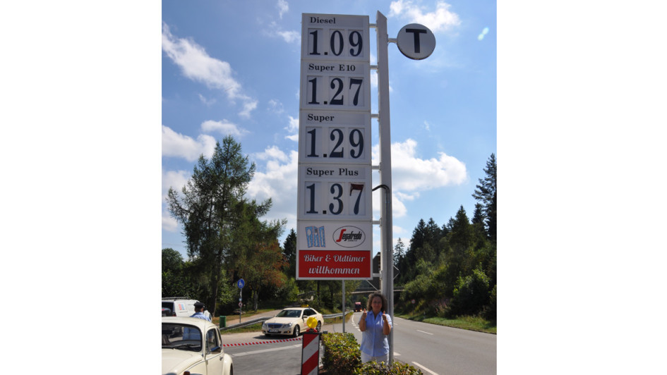 von 15: Passend zum Motto hat PWM einen Retro-Preismast gebaut. Andrea Eversberg aus dem Vertrieb des Preisanzeigenherstellers freut sich über das Ergebnis.