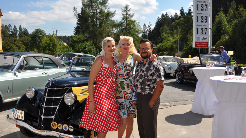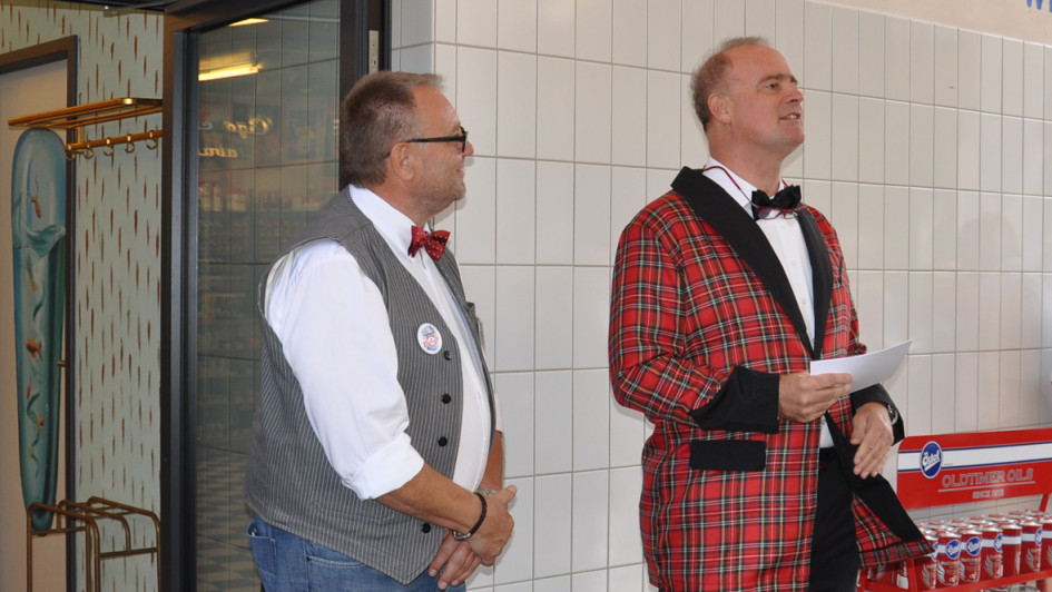 von 15: Einige Gäste und Mitarbeiter (links: Vertriebsassistentin Madeline Falk) haben ihr Outfit entsprechend der Mode der 60er Jahre ausgewählt.