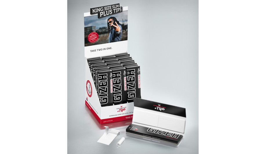 von 6: Mit den King Size Slim + Tips wird das Drehen noch angenehmer: Das Two-in-one-Produkt aus der Gizeh Black-Familie kommt zur InterTabac 2015 neu auf den Markt. Das Heftchen mit Magnetverschluss enthält 34 King Size-Blättchen und 34 Filter-Tips.