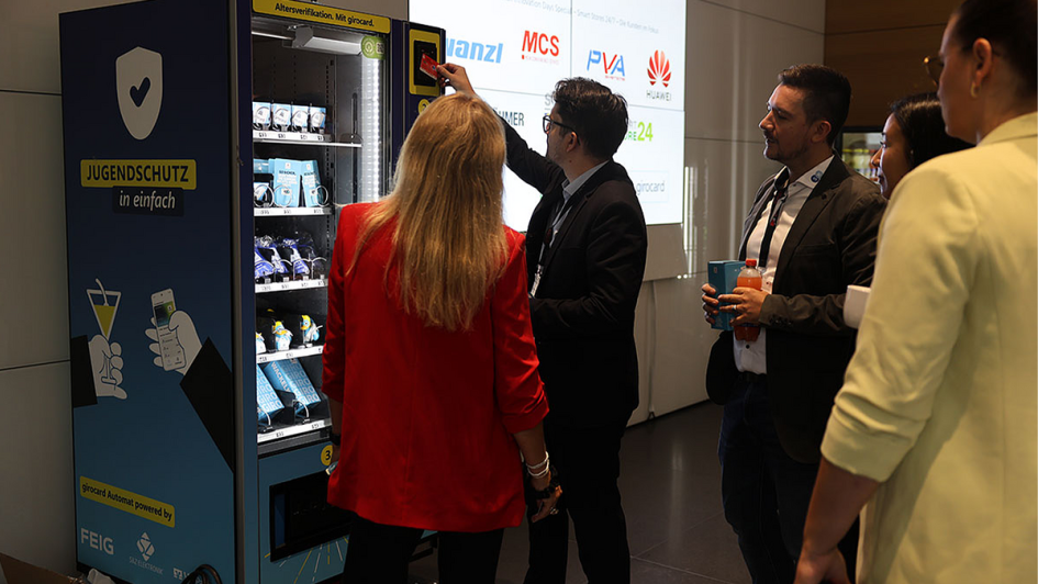 von 8: Verschiedene Aussteller präsentierten ihre Lösungen für Smartstores und die Digitalisierung des Handels. Hier der Automat des Girocard Anbieters mit Alterserkennung.