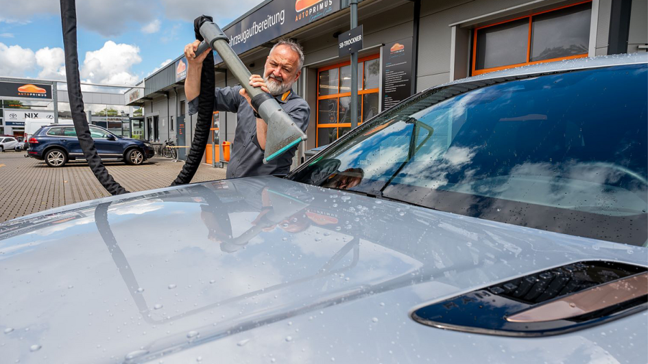 von 10: Mit der kostenpflichtigen Airffect-Trocknung erreicht Centerleiter Christian Huber den letzten Trocknungsschliff, denn Wasserreste werden aus Ritzen und Mulden entfernt.