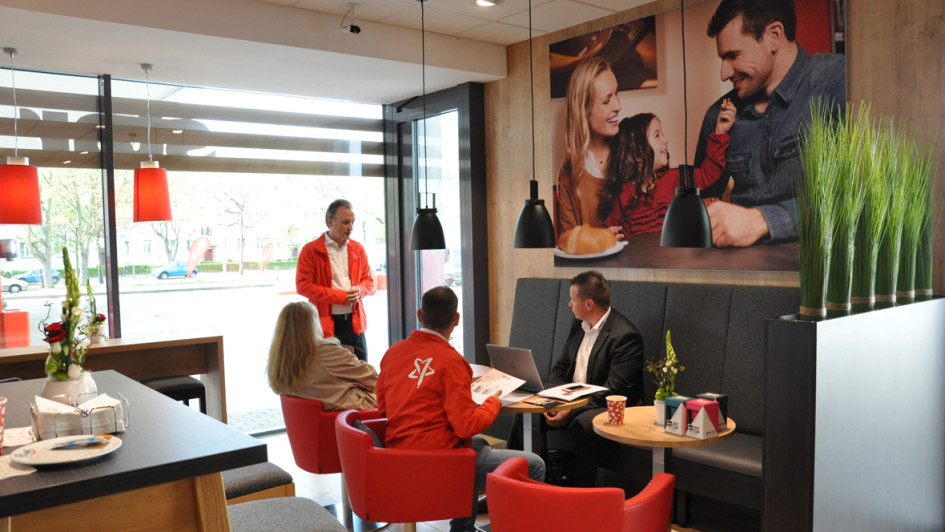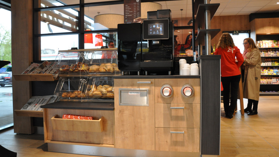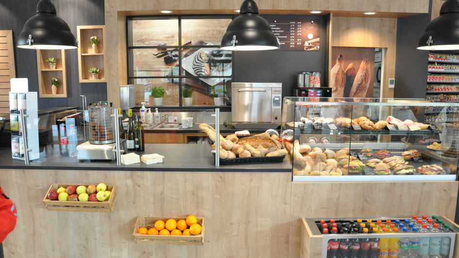von 9: Durch das Fenster im Hintergrund haben Mitarbeiter die Kassenzone im Blick, selbst wenn sie in der angeschlossenen Küche Brötchen schmieren.
