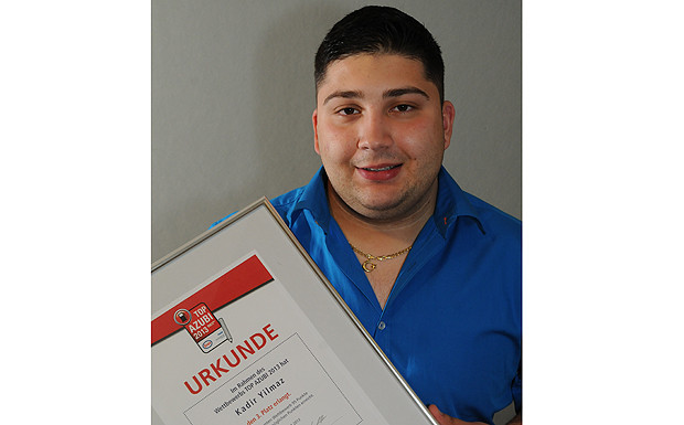 von 6: Untere Reihe: Die TOP AZUBIS Kadir Yilmaz (l.), Annika Steinmetz (Mitte) und Rouven Kramer (r.). Obere Reihe: Vertreter der Sponsoren Esso (Holger Haesloop, l.), PWM (Andrea Eversberg, Mitte) und autojob.de (Marc Wesner, r.) sowie Patrick Neumann, Chefredakteur des tankstellen markt.