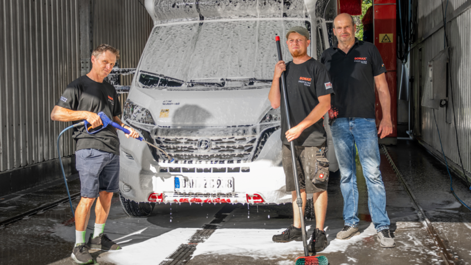 von 7: Sind von den Waschergebnissen begeistert (v. l. n. r.): Waschanlagenbediener Herbert Thurner, Vorwäscher Andreas Kröner und Sonax Bezirksleiter Sven-Holger Lück.