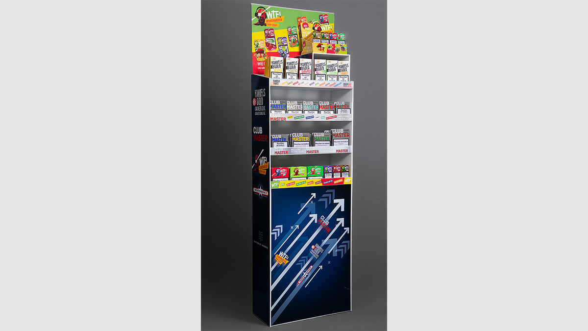 Der neuen "Family"-Bodensteller von Arnold André dient als dem Handel als aufmerksamkeitsstarkes Zweitplatzierungsdisplay, das die wichtigsten Shortfiller-Marken des Hauses präsentiert. Ob Clubmaster, Handelsgold, WTF! Shisharillo oder Independence – alle Marken finden in dem kompakten Bodensteller ihren prominenten Platz. Der Handel kann das Display flexibel nach individueller Kundennachfrage durch den Arnold André Außendienst bestücken lassen und das gesamte Shortfiller-Portfolio des Bünder Unternehmens auf kleinstem Raum präsentieren.