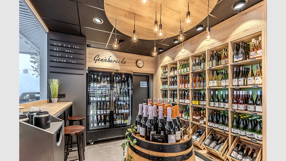 Die Thekenfront aus Eiche Halifax, zwei abgehängte Rahmen über der Theke als Baldachin, Leuchten aus Rauchglas und echte Fliesen an der Rückwand fokussieren bereits beim Eintritt auf Kaffee, Snacks und die Backwaren. Wer den Blick von der Kasse nach links schweifen lässt, der blickt auf zwei Weinfässer und die Genießerecke. Die Fässer sind zu einem Regal umgebaut. Dort werden hochwertige Winzersekte mit einem Verkaufspreis von 14 bis 19 Euro präsentiert.